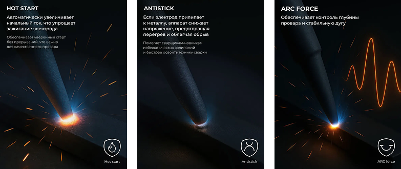 Производитель сделал ставку на интуитивное управление. Теперь не нужно быть профессиональным сварщиком: достаточно выставить ток по рекомендации в инструкции, надеть маску и можно браться за дело. Благодаря функциям «горячий старт» и «антизалипание» даже новичку легко получить ровный шов.